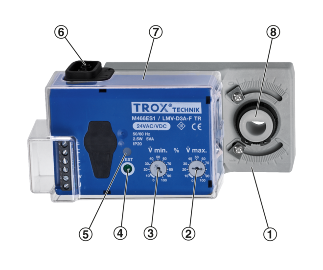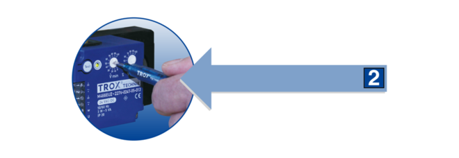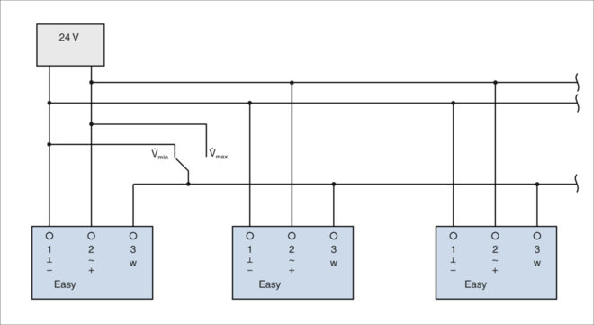 La valeur de consigne de débit provient d'un régulateur de niveau supérieur (par ex. régulateur de température ambiante, régulateur de la qualité d'air, système centralisé de gestion du bâtiment (GTB-GTC) ou de contacts de commutation). La régulation à débit variable donne une valeur comprise entre Vmin et Vmax. Il est possible d'outrepasser la régulation de température ambiante, par ex. en fermant entièrement la gaine.