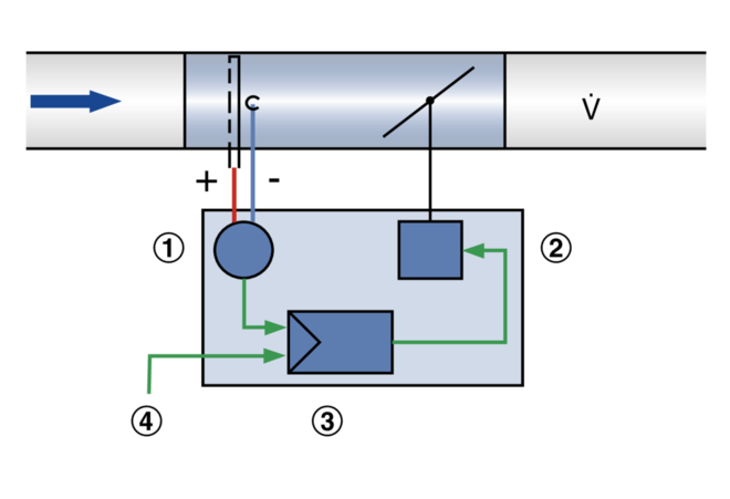 Le régulateur compare la valeur de consigne de débit à la valeur réelle et pilote le servomoteur intégré en conséquence.