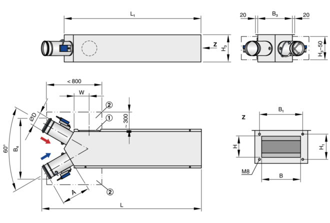 Boîtes de mélange VAV rectangulaires pour systèmes double gaine à débits variables et constants, compatibles, disponibles en 6 dimensions nominales.