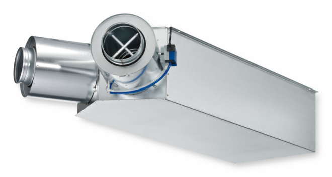 Unité opérationnelle constituée des pièces mécaniques et des composants de régulation électroniques. Chaque unité contient deux sondes de pression différentielle moyenne pour la mesure du débit, une dans le débit d'air froid et une dans le débit d'air total deux clapets et un silencieux intégré. Composants de régulation montés en usine, complets avec câblage et flexibles.